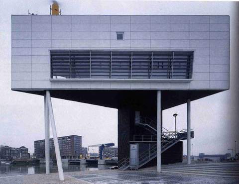 Die Gestaltung der Kai-Anlagen von Bolles + Wilson ist charakteristisch für den Maßstab der künftigen Entwicklung des Gebietes Kop van Zuid, der früheren Docks von Rotterdam. Größtes Bauwerk ist das Gebäude der Brückenwacht, die den beweglichen Teil der Erasmus-Brücke sowie der anderen Hebebrücken der Maas kontrolliert. Die drei Fassaden des Baus sind in unterschiedlichen Materialien verkleidet - glasierter Backstein an der Straßenseite, Flachblech an der zum Hafen gerichteten Seite und gebrannte Emailplatten am Kai. Dadurch sieht das Gebäude auf jeder Seite anders aus. Eine höher gelegene Promenade, deren Belag mit rauem Granit ebenfalls von den Architekten gestaltet wurde, führt zu diesem Hochhaus am Ufer. Von unten beleuchtete "elektronische Felsen" und ein "Turm der elektrischen Zahlen" geben dem Ensemble eine künstlerische Prägung. |